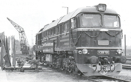 originalen russischen Schalldämpfer) eine Lok der ersten Lieferserie. Diese wurden noch ohne Schalldämpfer von der DDR 1966-Sep.68 aus der UdSSR (Lugansk) importiert. Es waren die Maschinen V200 001-107. Weitere