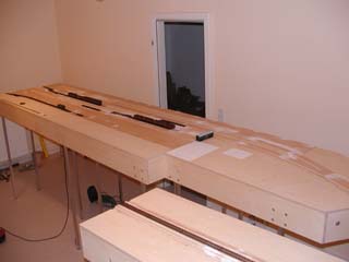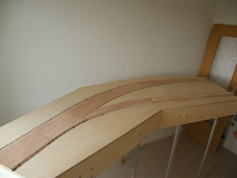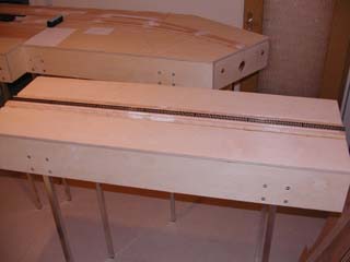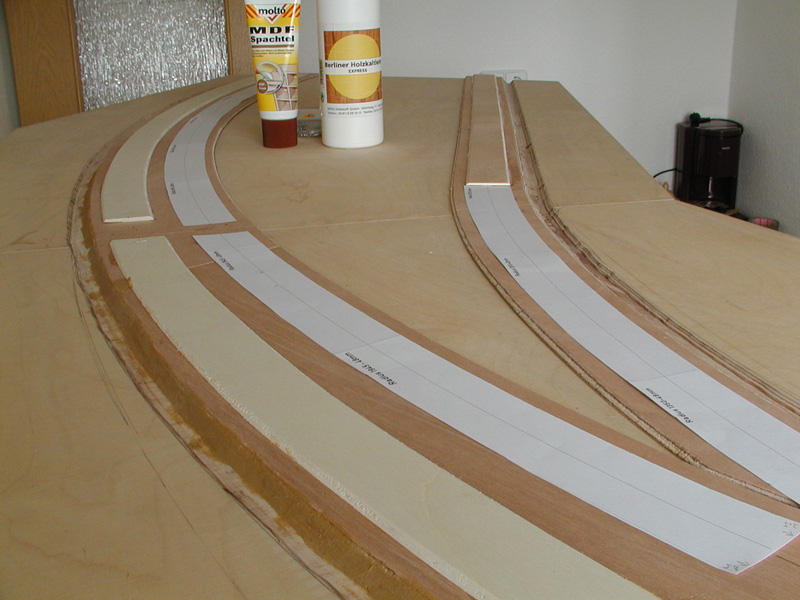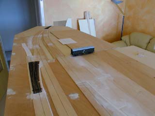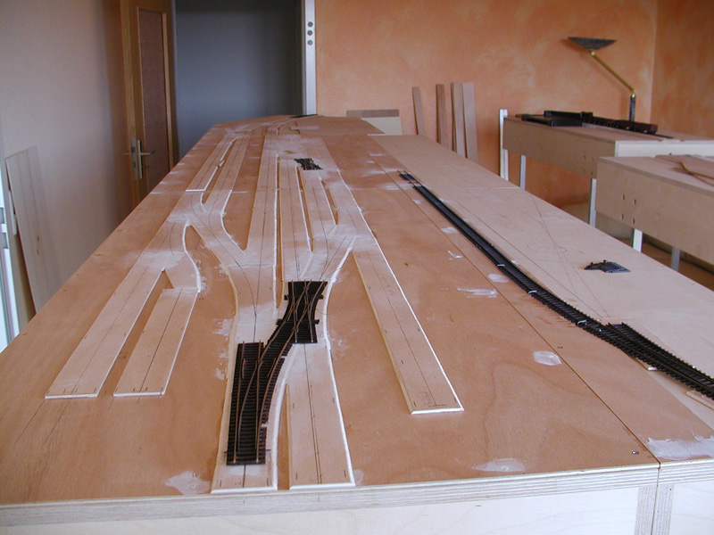 Hier sind die Modulteile des eigentlichen Bahnhofs zusammengesetzt. Im Vordergrund steht noch das Teil, welches die Einfahrt mit dem