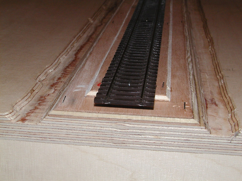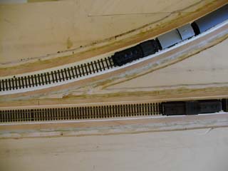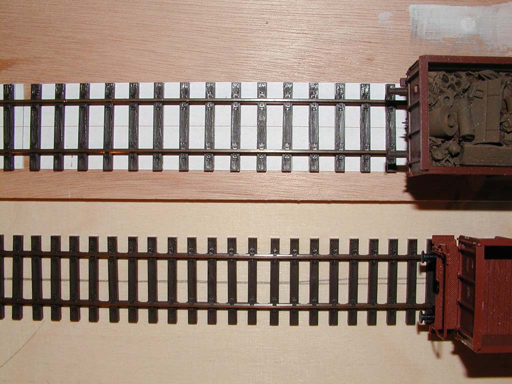 Sie sind zu erkennen an den größeren Schwellenabständen (oberes Gleis). Das Gleis der Staatsbahn wird in Reichsbahn-Oberbau K mit Holzschwellen bzw. im Bahnhof teilweise mit Stahlschwellen erstellt.