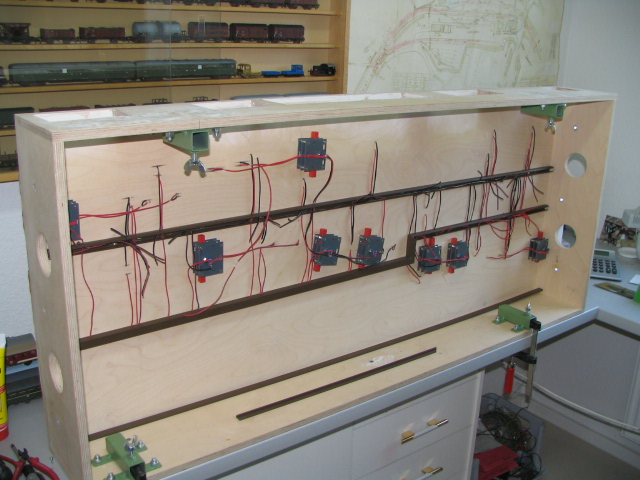 Hier verläuft in einem Kabelkanal eine Sammelschiene. An ihr lassen sich auf der gesamten Länge direkt die Einspeisungen zu den Gleisen anlöten.