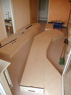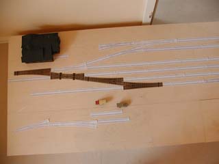Hier links, die 5 Teile des Bahnhofs... ...und daneben liegt die aus 4 Teilen bestehende linksseitige Ausfahrt. Auf diesem Modul werden die Gleise der Staats- und Kleinbahn bis zum Abzweig nebeneinander