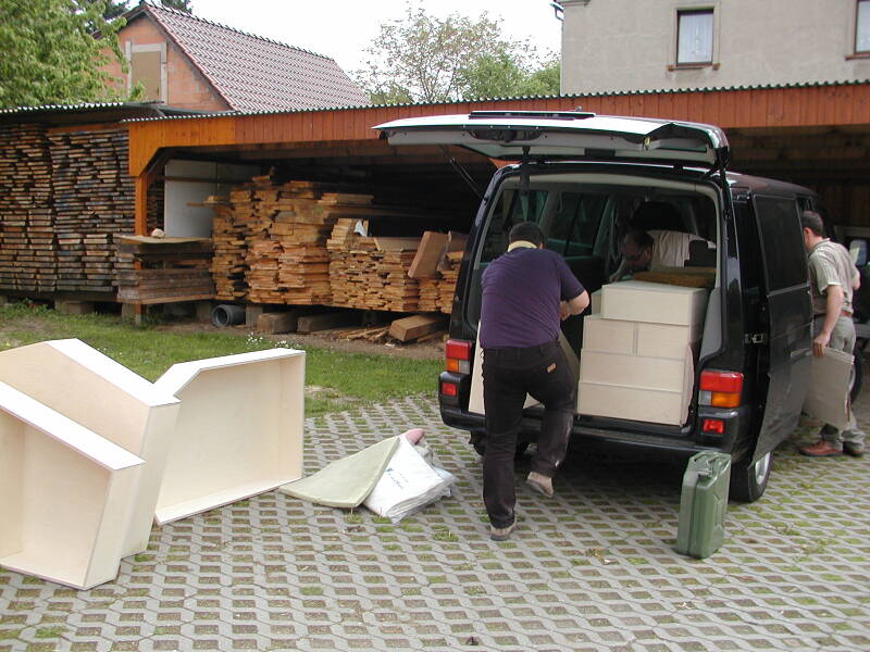 Am 08.Mai 2004 war es endlich soweit, die 10 Modulkästen waren fertig und konnten bei der Tischlerei Stübner in Baruth/Sachsen abgeholt werden. Die Module sind in bester Qualität, aus 15mm wasserfesten Multiplex-Sperrholzplatten gefertigt. 280km Fart nach Sachsen, die sich gelohnt haben. Sicherlich hätte ich die Teile auch hier in Berlin oder Brandenburg fertigen lassen können, aber Baruth ist der Nachbarort von Weißenberg und was liegt da näher, Firmen aus der Umgebung zu nutzen und zu unterstützen.