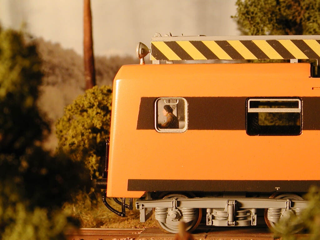 Dies sind unter anderem Stromabnehmer, Puffer, Bremsschläuche und Griffstangen, sowie die beiden Führerpulte, wie sie auch in der BR 243 vorzufinden sind. Griffstangen, Puffer und Bremsschläuche wurden durch Weinert Teile ersetzt, da die beigelegten Industriespritzlinge viel zu grob sind.[Eher was für LGB-Bahner :-) ] Da ich das Modell nicht nur als Standmodell in eine Vitrine stellen wollte, mußten die Trittstufen sowie Teile der Bühne neu angefertigt werden. Die mitgelieferten Teile waren so dünn geätzt, daß sie sich schon beim Heraustrennen verbogen. Zudem sollte das Geländer beweglich gestaltet werden. Daß einige Teile neu angefertigt werden mußten, lag daran, daß der Bausatz für die Spurweite TT konzepiert war und für die Spurweite H0 nur “aufgeblasen” wurde. Hier hätte man für´s H0-Modell stärkeres Material verwenden sollen. Das Dach bereitete auch diverse Schwierigkeiten. Da die seitlichen Dachschrägen nicht dem Vorbild entsprochen hätten, wurde hier mit Zweikomponentenklebstoff und viel Schleifarbeit nachgeholfen. Auf dem Dach mußten die Löcher für den Stromabnehmer auch geändert werden. Die Isolatoren hätten sonst schräg gestanden. Nach dem Lackieren kamen die mitgelieferten braunen Decal-Seitenstreifen ebenfalls nicht zum Einsatz, sondern wurden auflackiert. Auch hier gab es ungenauigkeiten im Bereich der Fenster. Auch eine eigene neue Triebfahrzeugnummer und die Beschriftung brachte Thomas an. Außerdem wurde das Fahrzeug mit einer Beleuchtung versehen. Hierzu mußten einige Halterungen für die LED´s angefertigt werden. Das etwas grelle weiße Licht wird durch Decodereinstellungen noch etwas gedimmt.