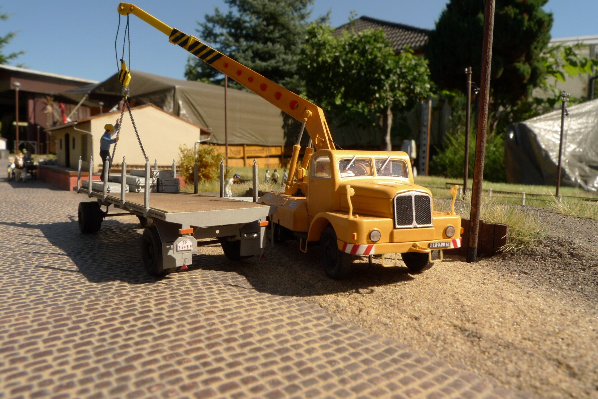 Der ADK 63 hat Betonplatten für einen Kolonnenweg am Haken.