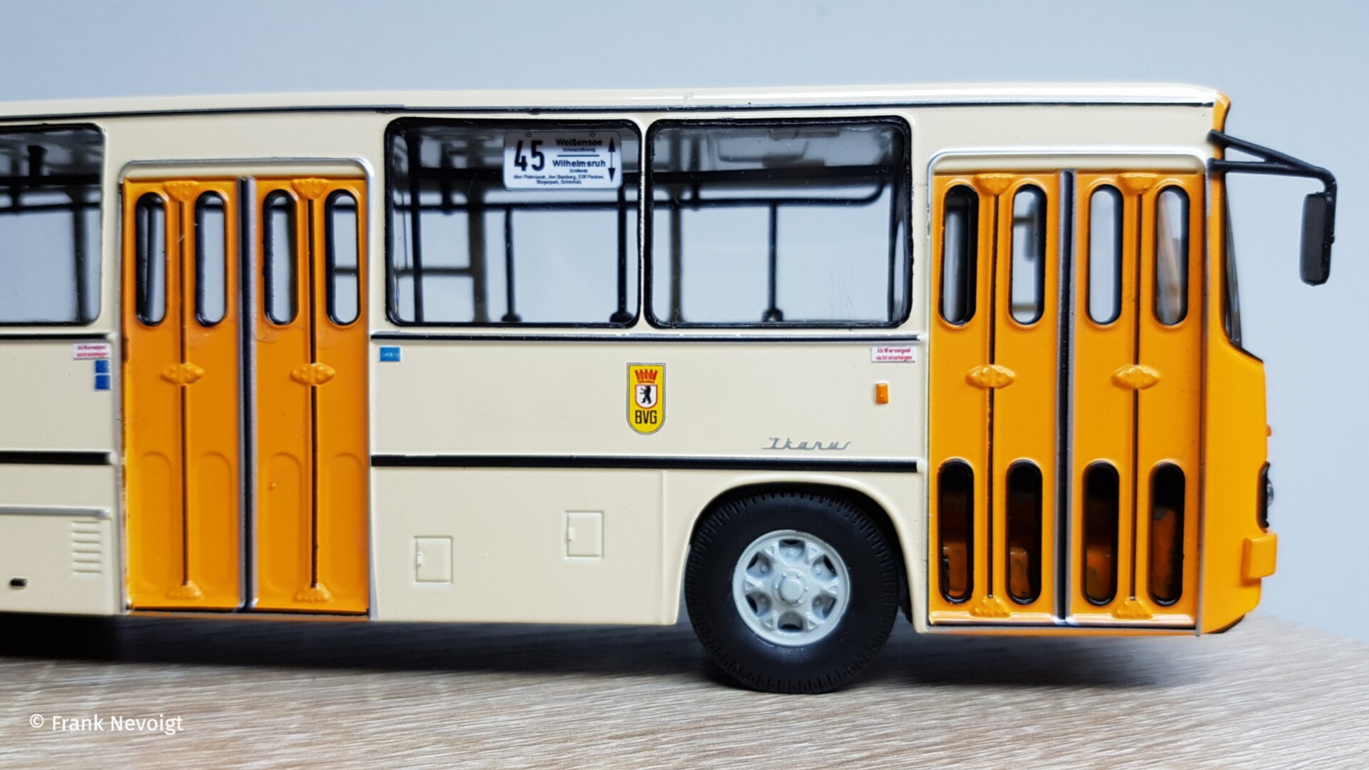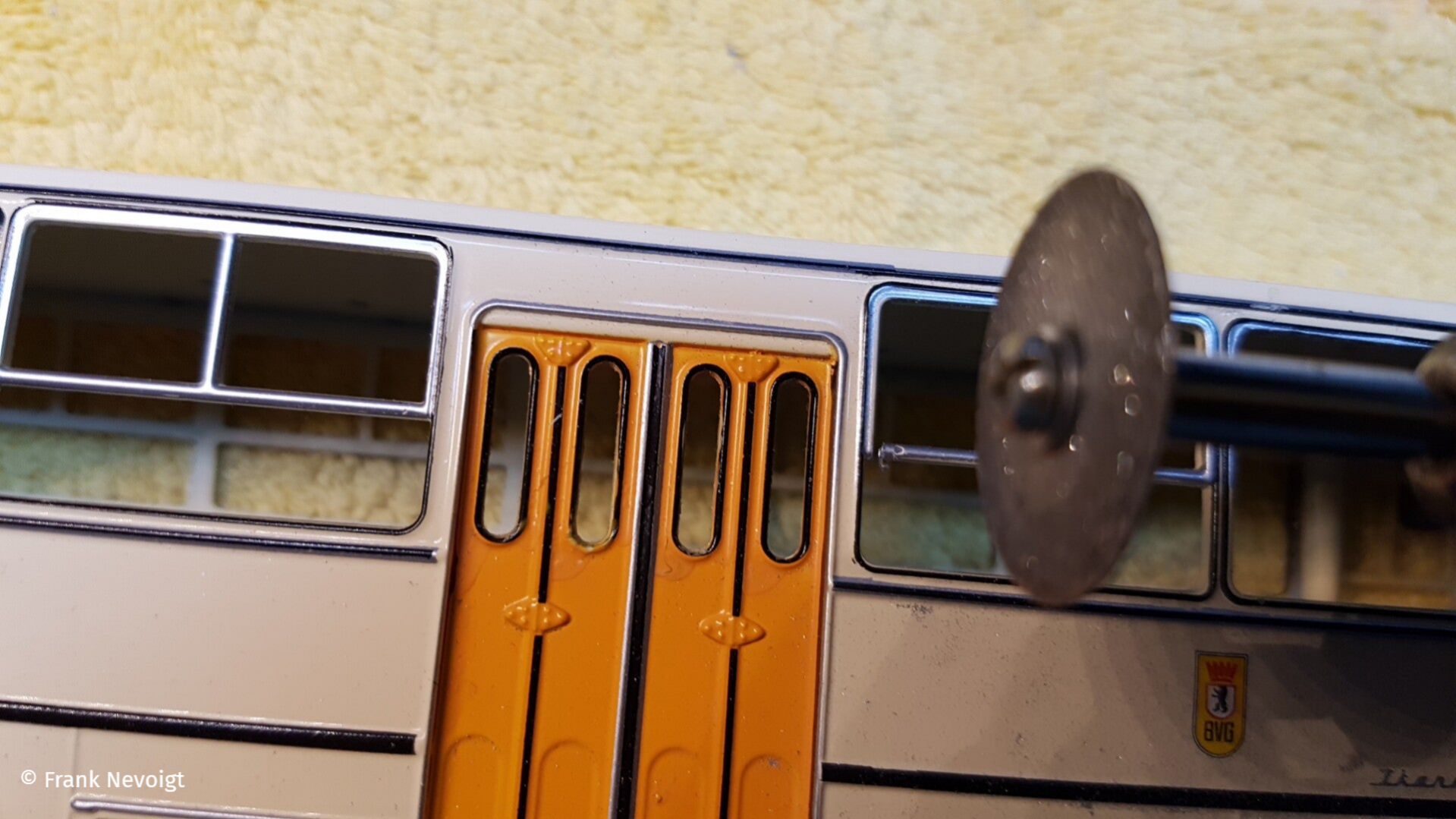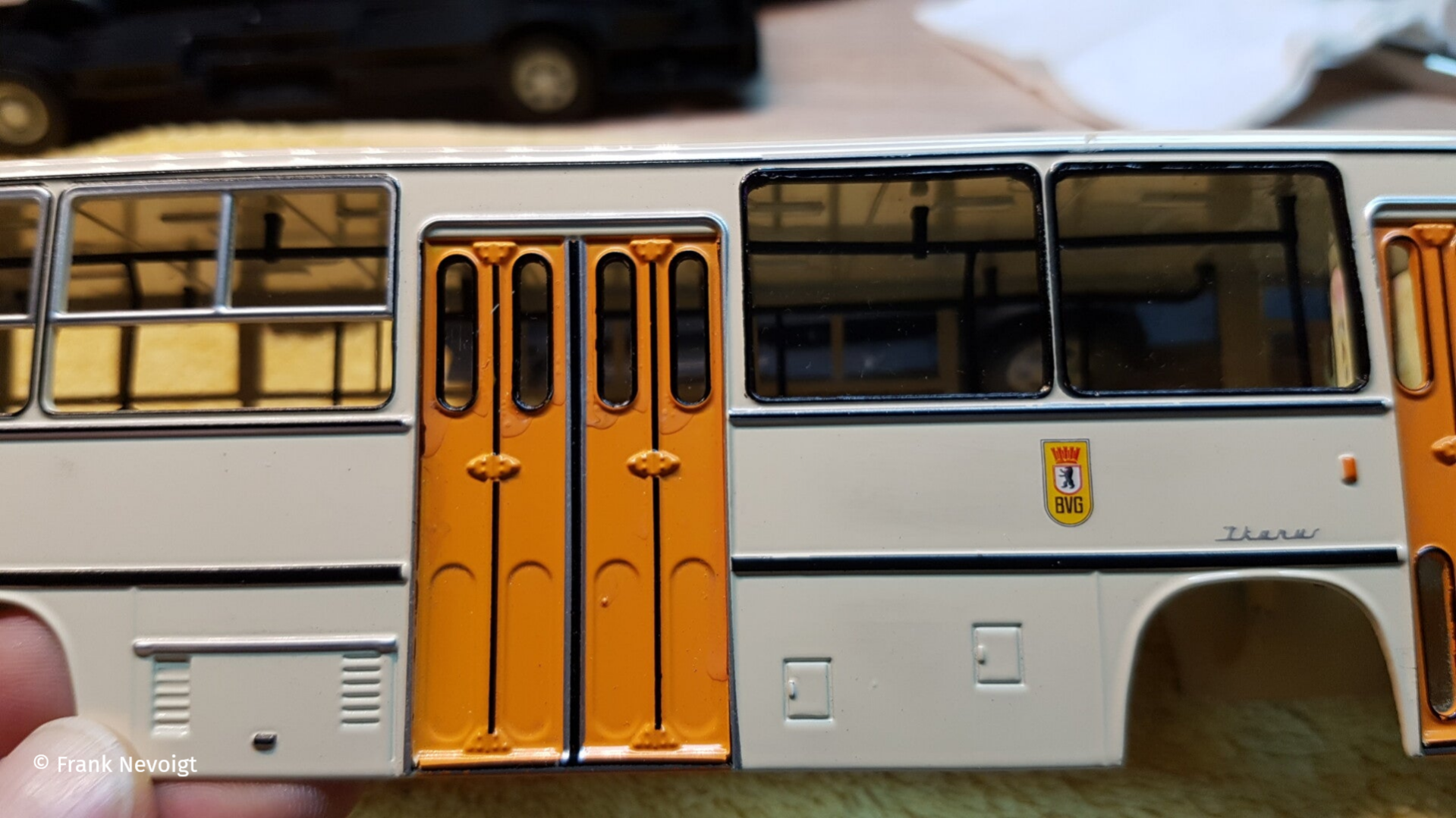 Einige Piktogramme an den Türen mussten noch angefertigt werden. Das BVB Logo muss noch über die mittlere Achse wandern und neben dem Ikarus Schriftzug kommt noch eine Wagennummer in Schwarz rauf. Außerdem müssen am Nachläufer die runden Rückstrahler Katzenaugen) unter der Stoßstange, gegen dreieckige ausgetauscht werden.